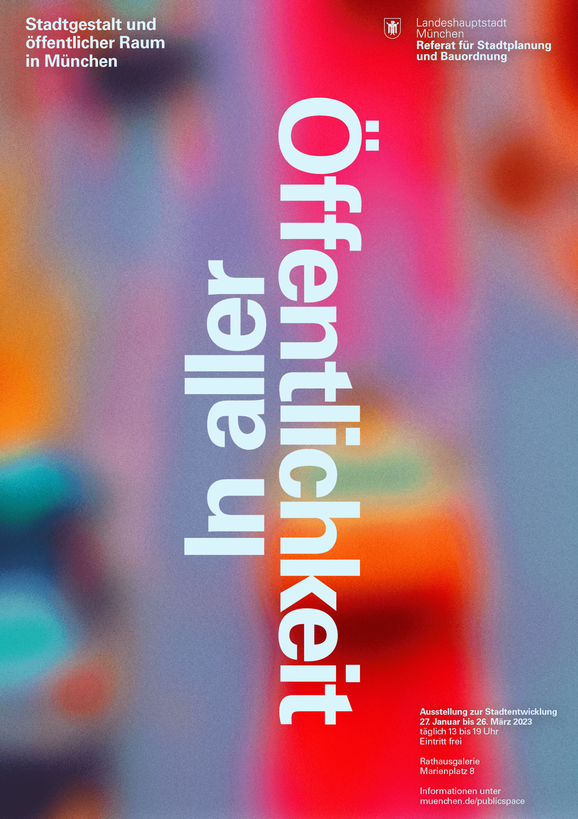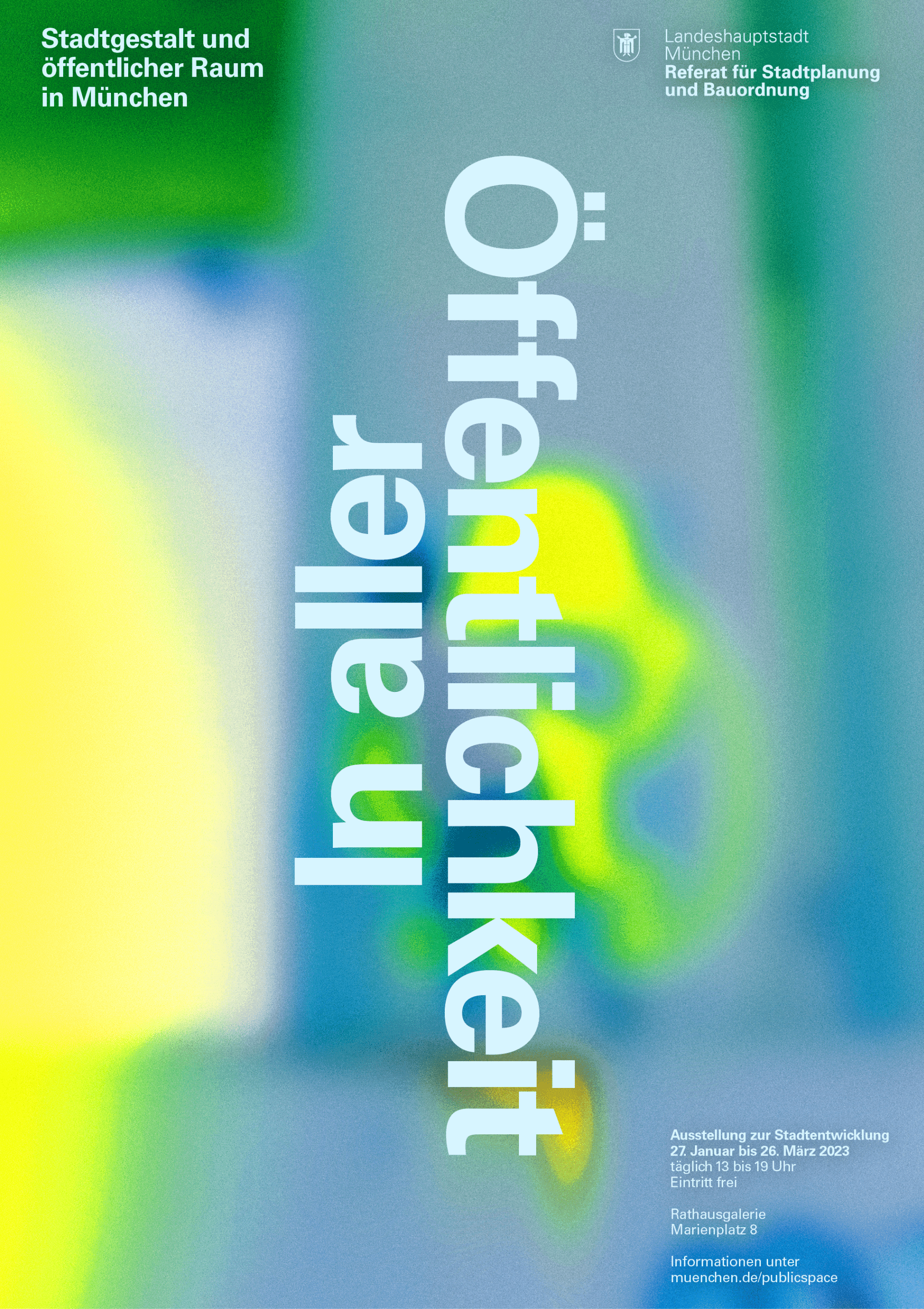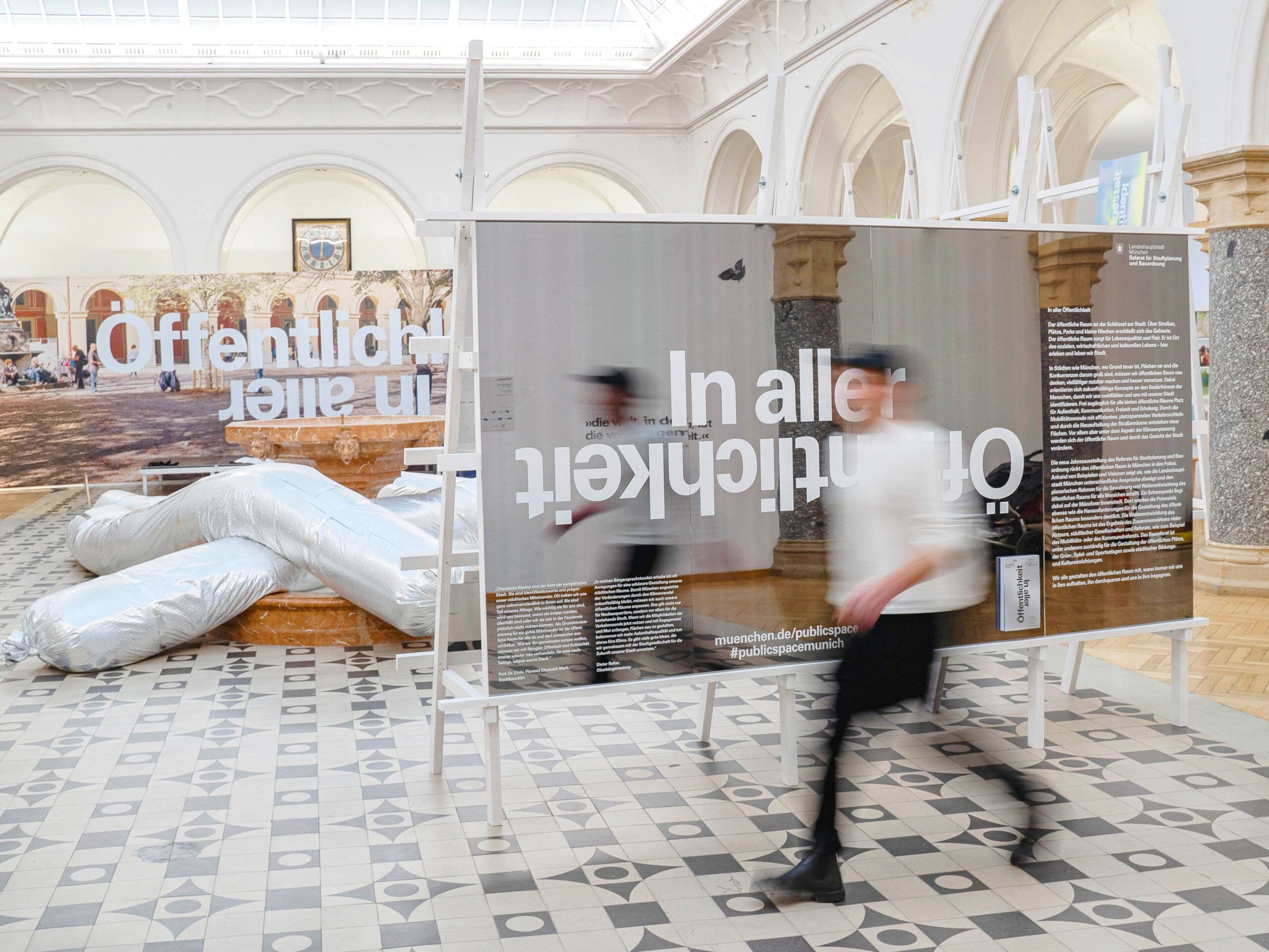 The 2023 annual exhibition for Munich’s Department of Urban Planning and Building Regulations explored public spaces as a reflection of society under the theme "In Aller Öffentlichkeit" ("In Public View"). The exhibition aimed to make Munich's urban spaces visible, accessible, and experiential, emphasizing the ongoing dialogue between diverse users and how they shape these spaces. A central feature was a 15-meter-long reflective seating sculpture around the fountain in the Town Hall Gallery, symbolizing this dialogue. The sculpture’s transformation reflected the varying needs of visitors, raising questions such as "What is public space?", "Who decides its use?", and "What defines Munich’s character?". These questions were explored through the exhibition’s themes, as well as discussions, walks, tours, and a public library in the atrium. The exhibition avoided a strict hierarchy, encouraging visitors to wander and explore. This approach created a personal journey through Munich’s public spaces, raising awareness of everyday urban experiences and fostering a deeper connection to the city.