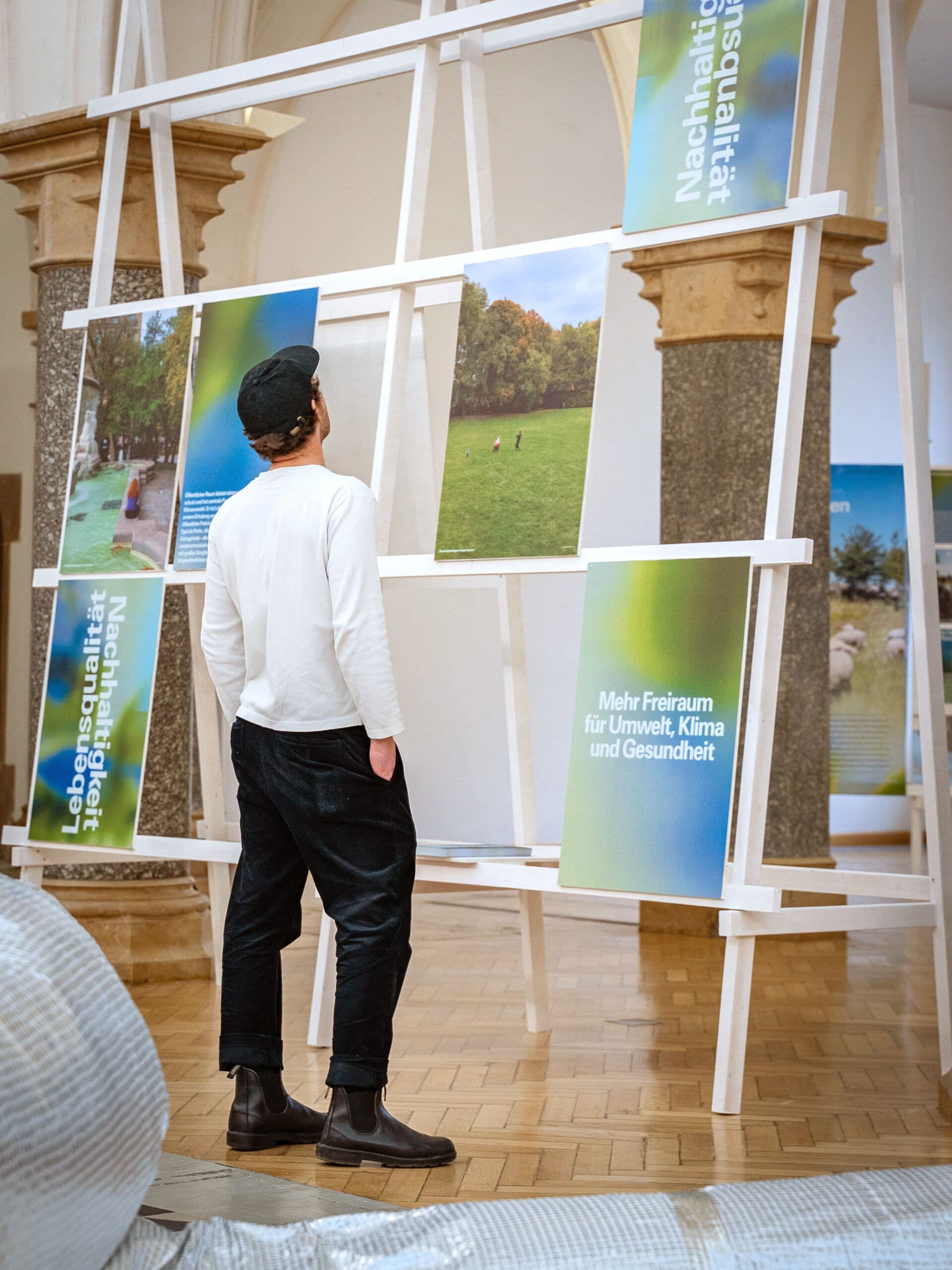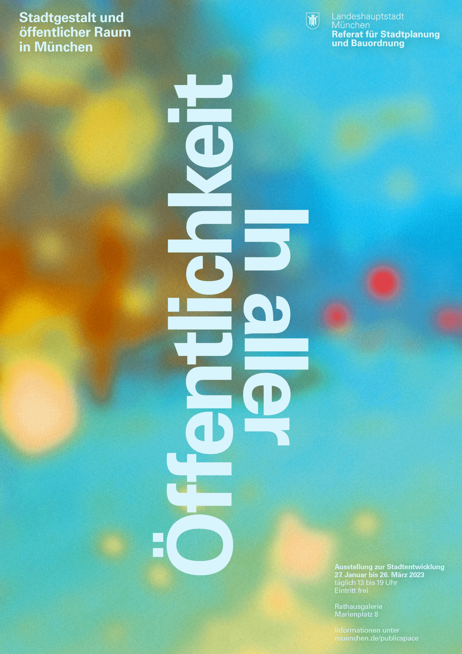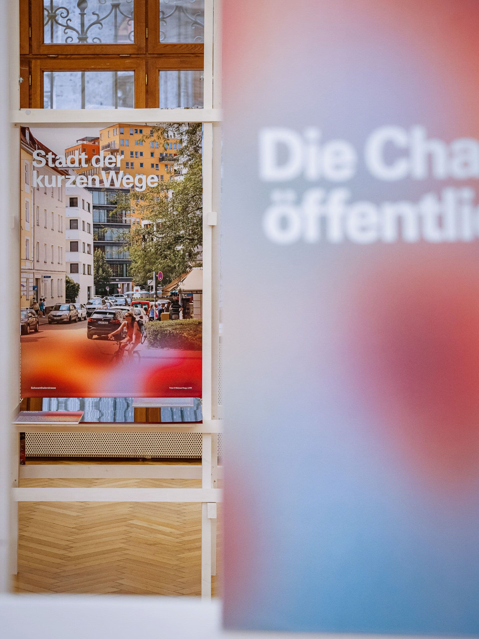 The 2023 annual exhibition for Munich’s Department of Urban Planning and Building Regulations explored public spaces as a reflection of society under the theme "In Aller Öffentlichkeit" ("In Public View"). The exhibition aimed to make Munich's urban spaces visible, accessible, and experiential, emphasizing the ongoing dialogue between diverse users and how they shape these spaces. A central feature was a 15-meter-long reflective seating sculpture around the fountain in the Town Hall Gallery, symbolizing this dialogue. The sculpture’s transformation reflected the varying needs of visitors, raising questions such as "What is public space?", "Who decides its use?", and "What defines Munich’s character?". These questions were explored through the exhibition’s themes, as well as discussions, walks, tours, and a public library in the atrium. The exhibition avoided a strict hierarchy, encouraging visitors to wander and explore. This approach created a personal journey through Munich’s public spaces, raising awareness of everyday urban experiences and fostering a deeper connection to the city.