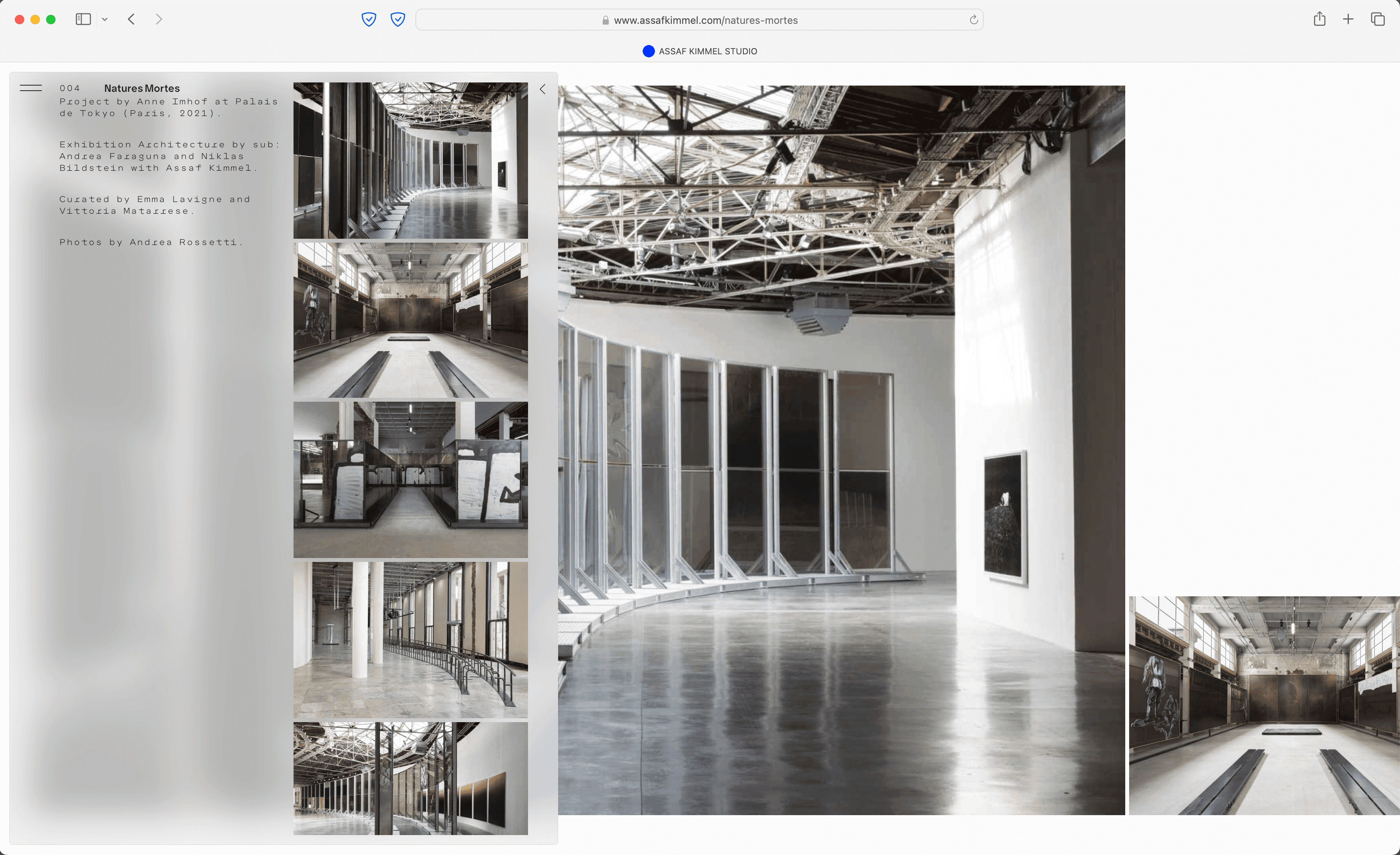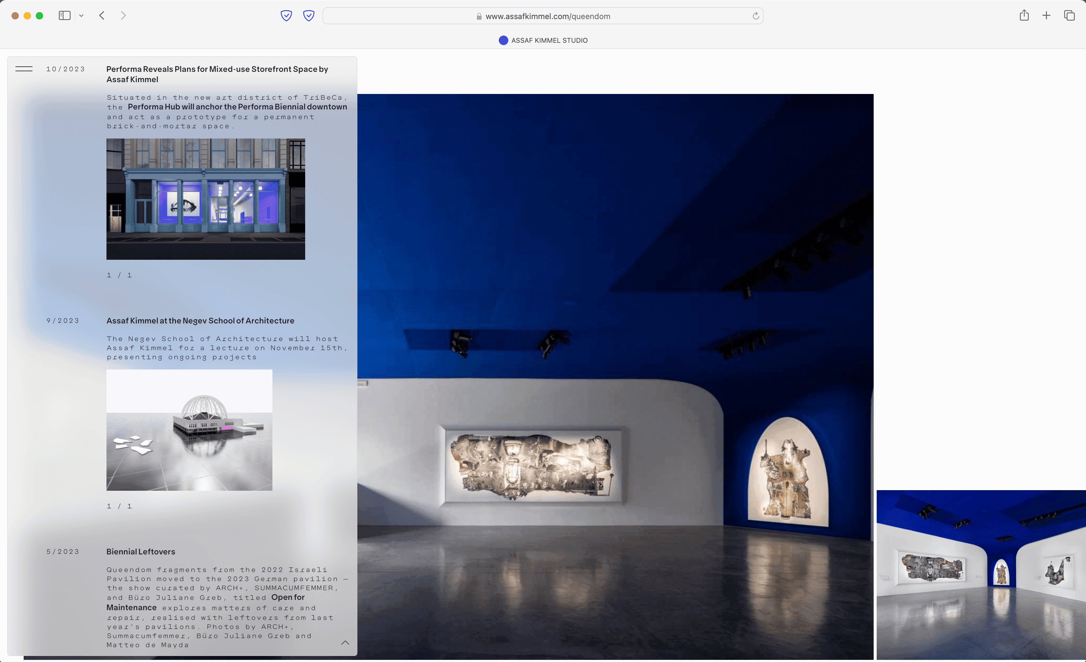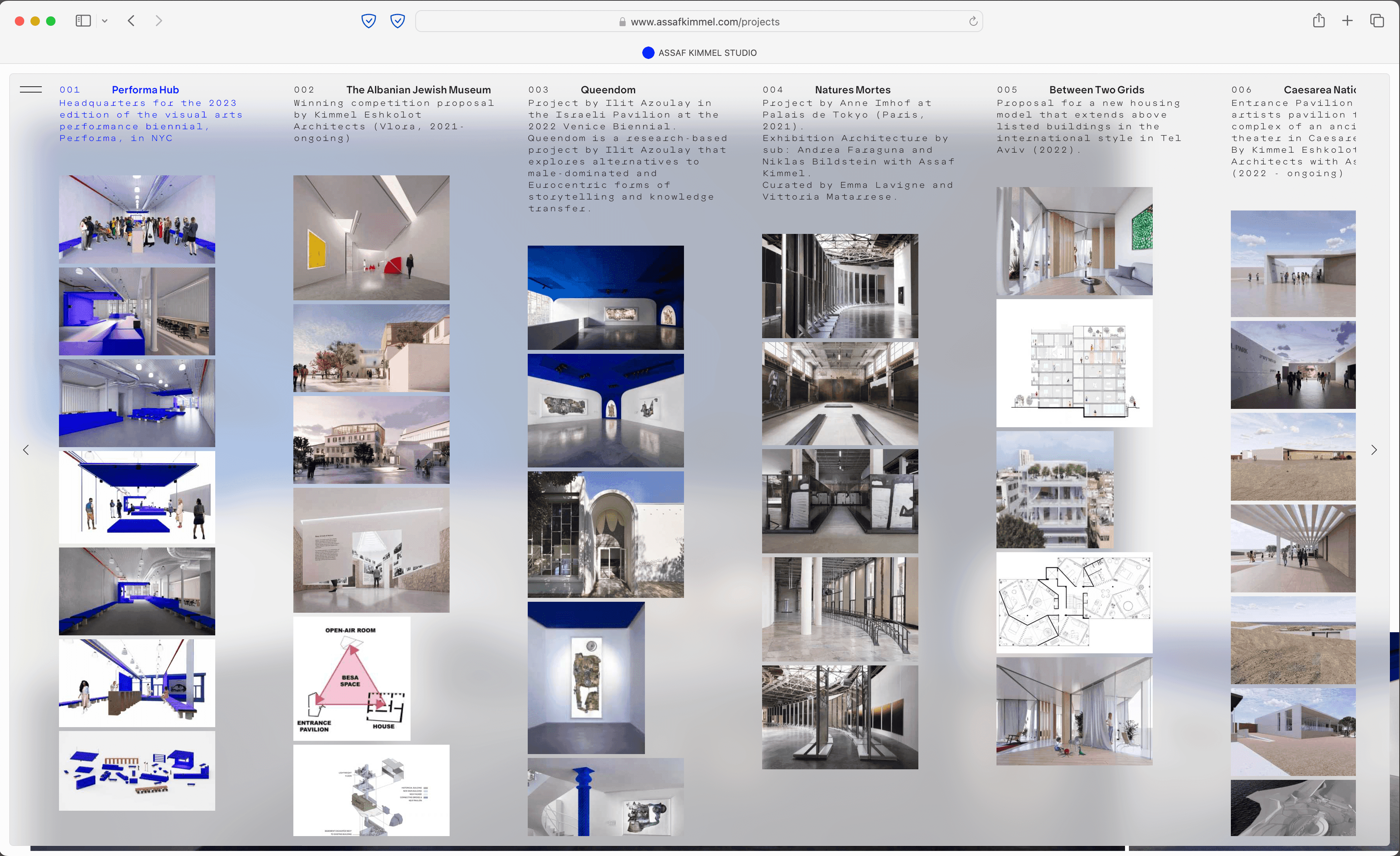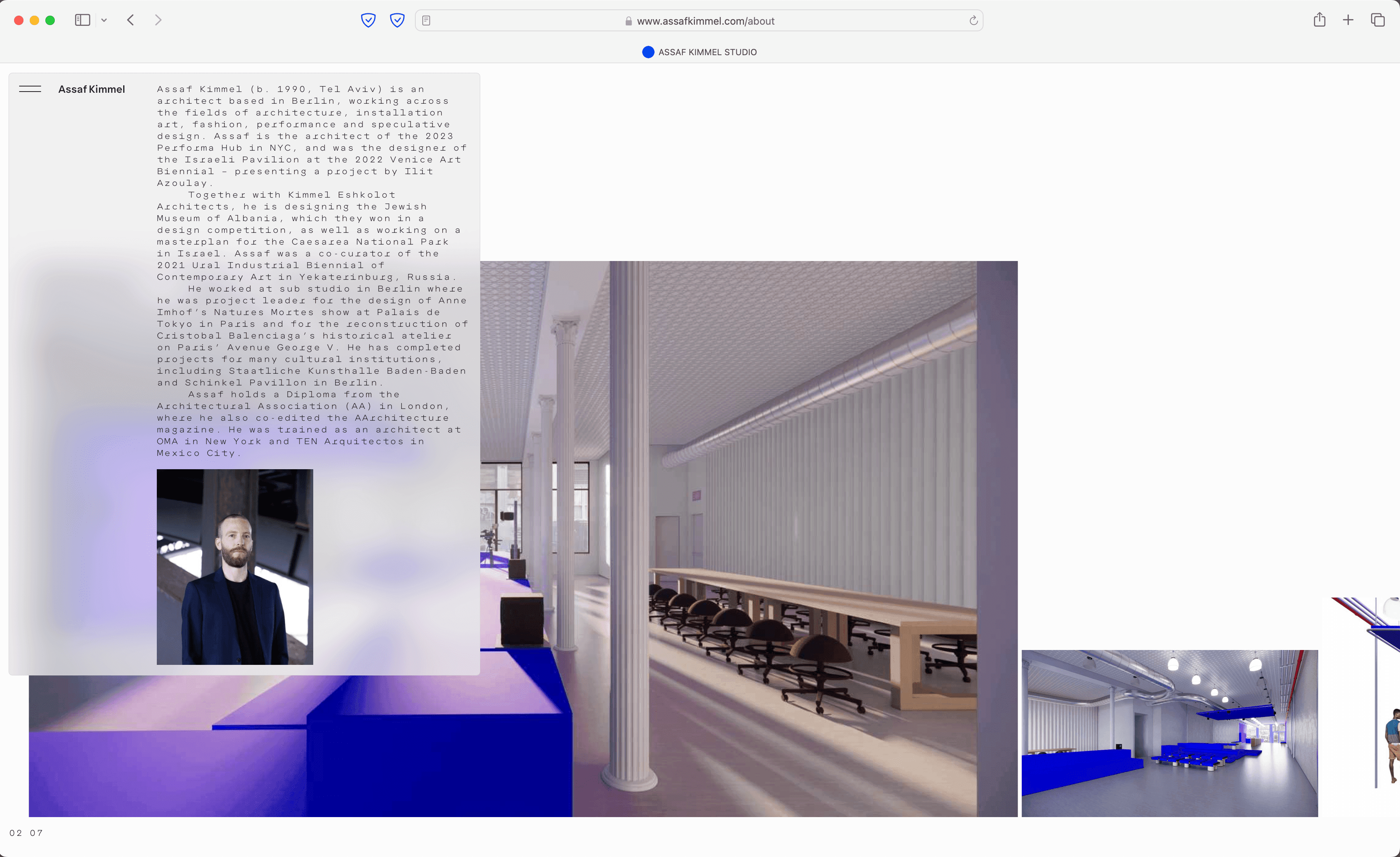 Assaf Kimmel is a Berlin-based architect working across various fields, including architecture, installation art, fashion, performance, and speculative design. His work explores the intersections of these disciplines, aiming to create projects that blend functionality with experimentation. The concept for his website reflects this approach, incorporating a dynamic widget designed to centralize and simplify navigation. The widget functions as an all-in-one tool, serving as the menu, main navigation, archive, and primary information layer. It allows users to access key content in an efficient and straightforward manner. Beneath the widget, project images are displayed in a custom slider that adapts dynamically, adding visual depth and organization to the site. The website’s layered design emphasizes clarity while supporting a broad range of content, mirroring the multidisciplinary nature of Kimmel’s work. By combining interactivity and functionality, the site offers a user-friendly way to explore his projects and ideas.