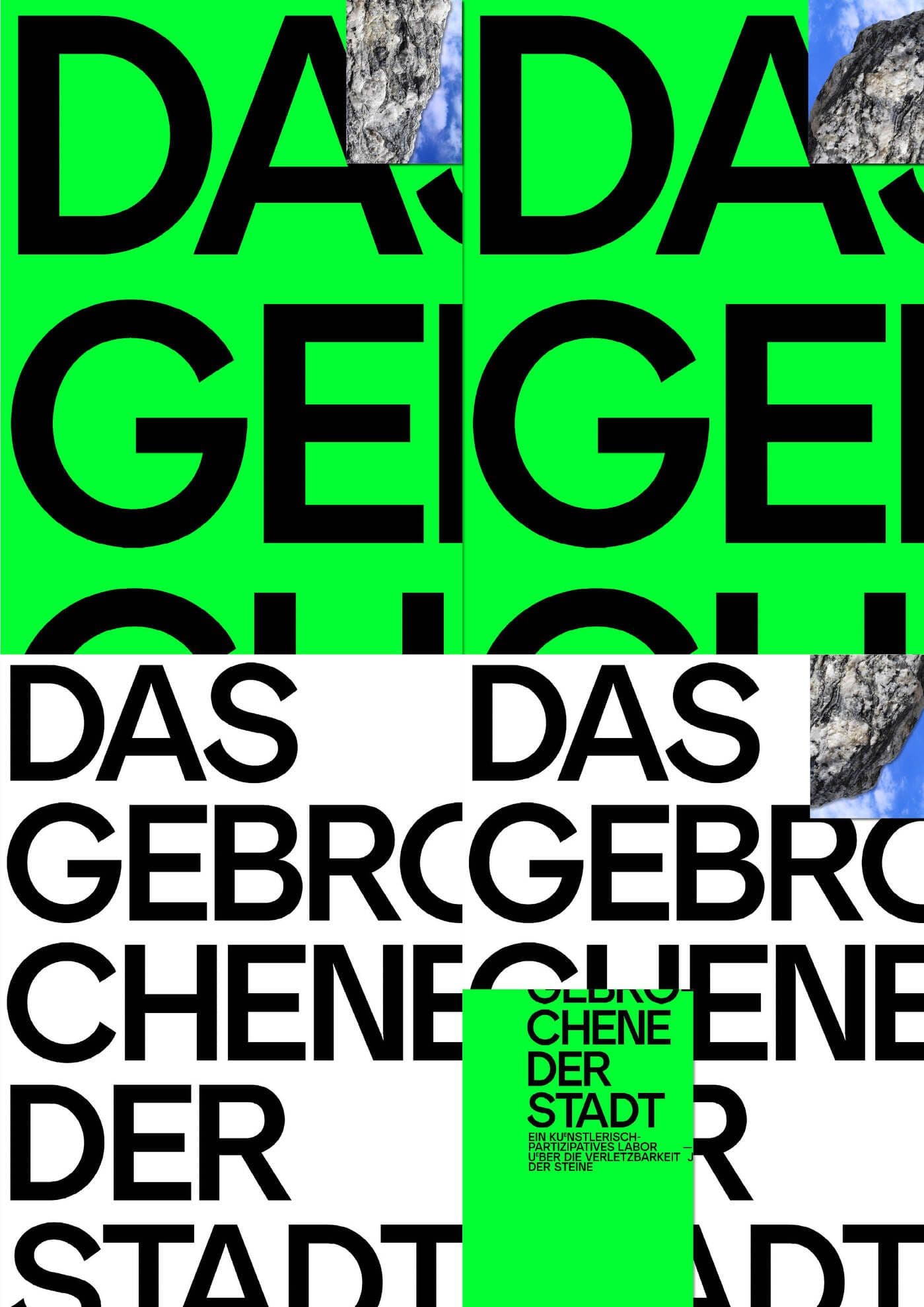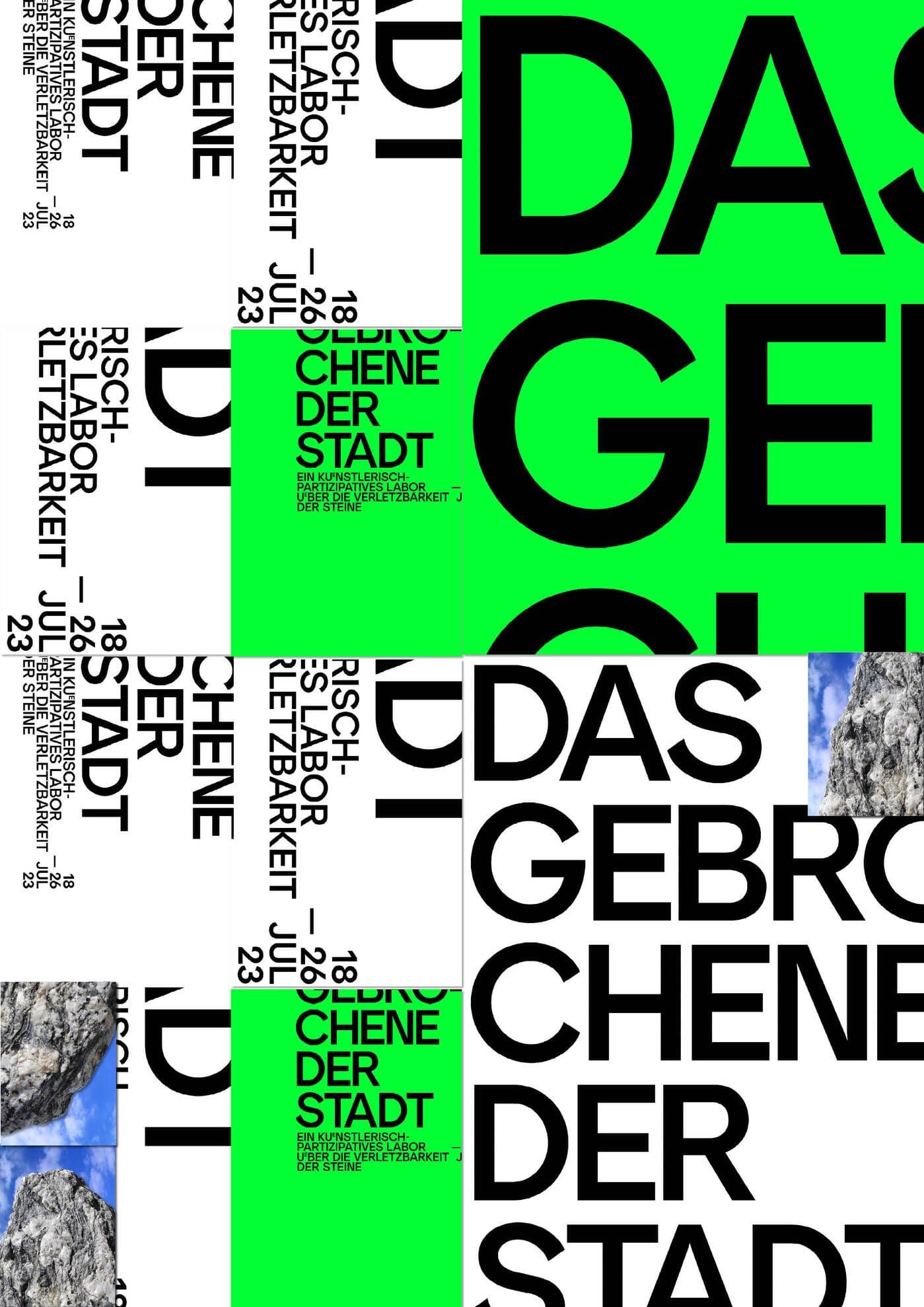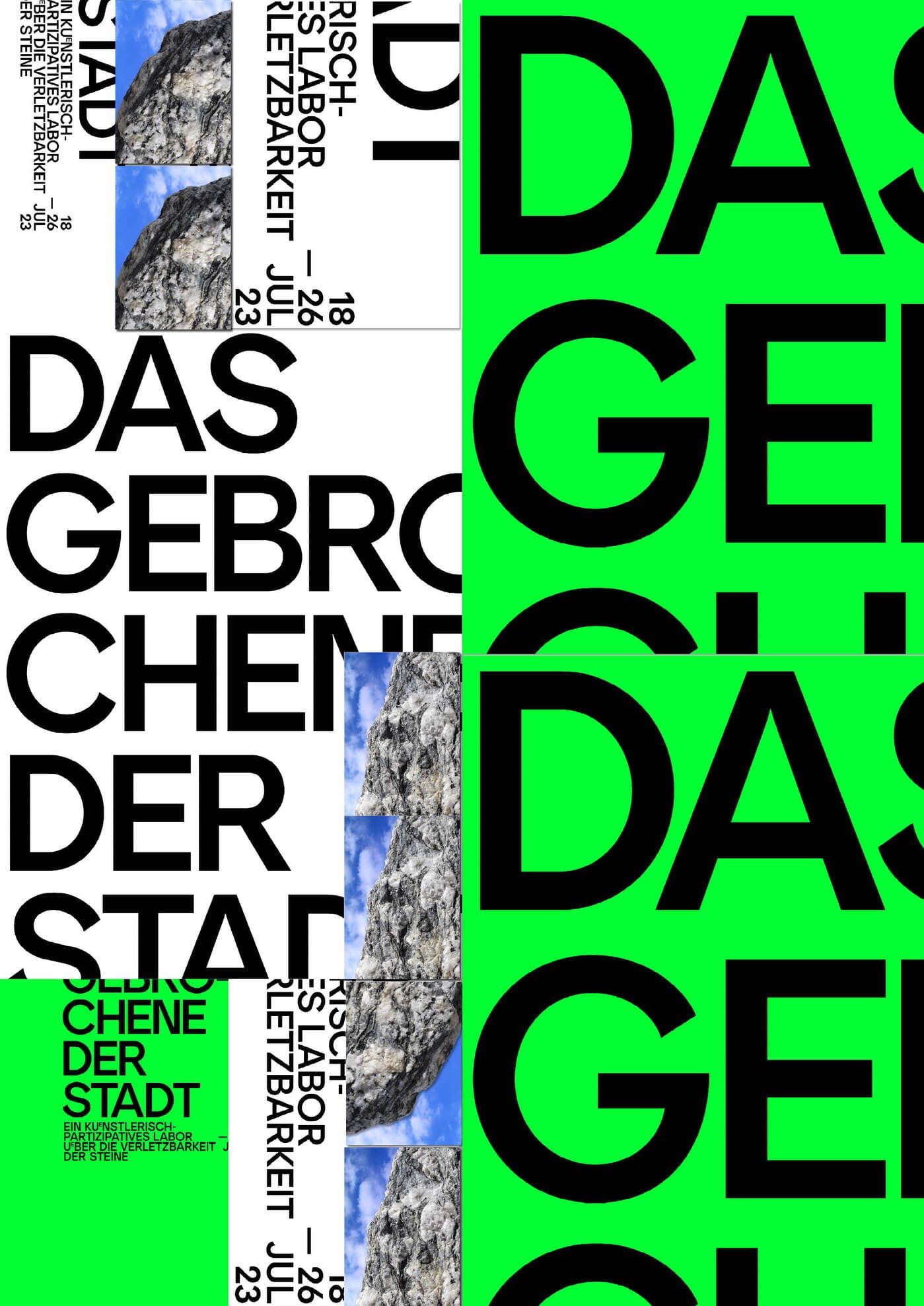 The visual identity for Das Gebrochene der Stadt is bold and reductive, reflecting the project’s focus on fragments and provisional forms. Neon green and white define the palette, creating high-impact visuals that demand attention and evoke the intensity of urban materiality. Posters are treated as fragmented compositions, with clean, angular shapes that reference the broken and the incomplete. Photographic stone textures are integrated as striking visual elements, anchoring the design in the material focus of the project The identity’s simplicity and sharp contrasts mirror the project’s raw and unpolished ethos, presenting a visual language that feels immediate, grounded, and unapologetically direct.