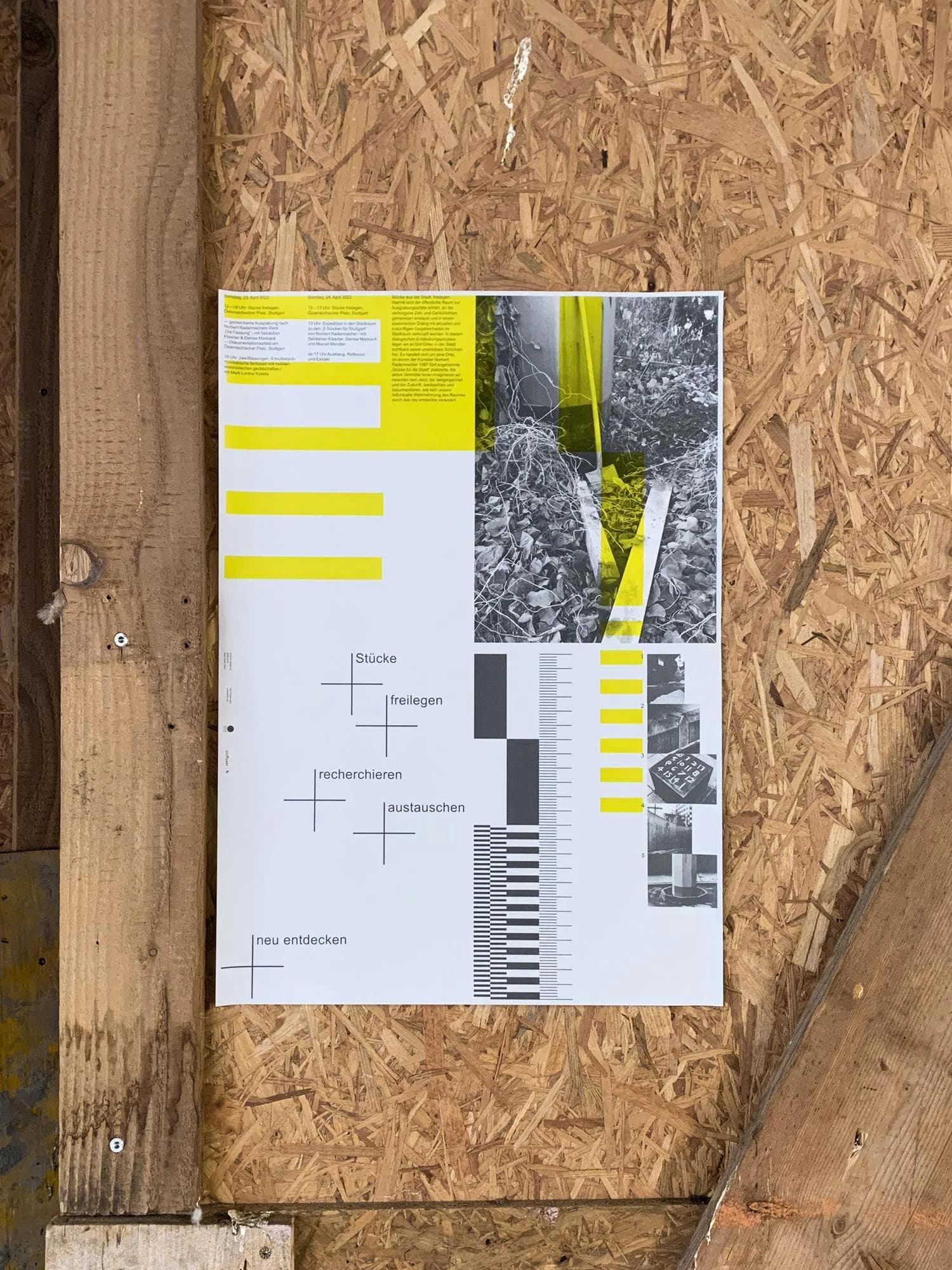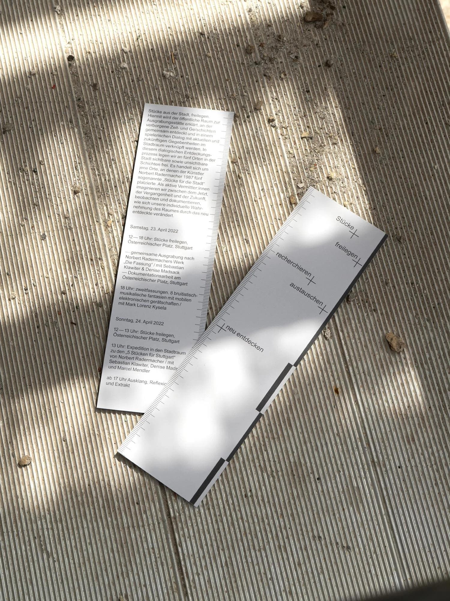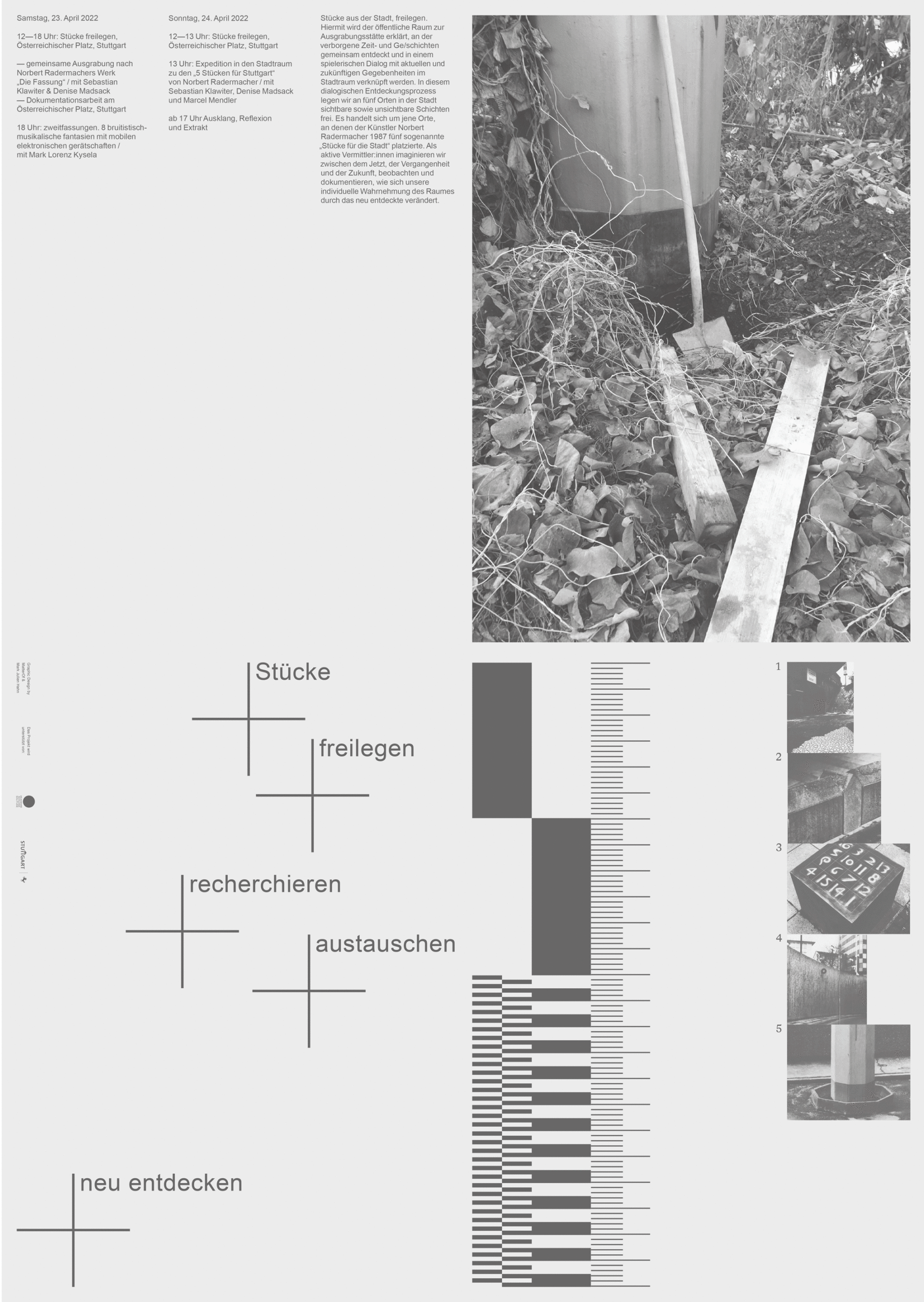 Identity design for Stücke freilegen, an archeological performance event by Sebastian Klawiter and Denise Madsack. The project focused on five public spaces designated as excavation sites, where artist Norbert Radermacher had installed “pieces for the city” in 1987. These artworks, along with the layers of time and stories embedded within them, were rediscovered and reconnected to their urban surroundings. The design concept draws inspiration from traditional archeological tools and measurement aesthetics. In collaboration with the artists, we developed a comprehensive urban archeology toolkit, featuring a mobile action cart designed for hands-on urban excavation events.