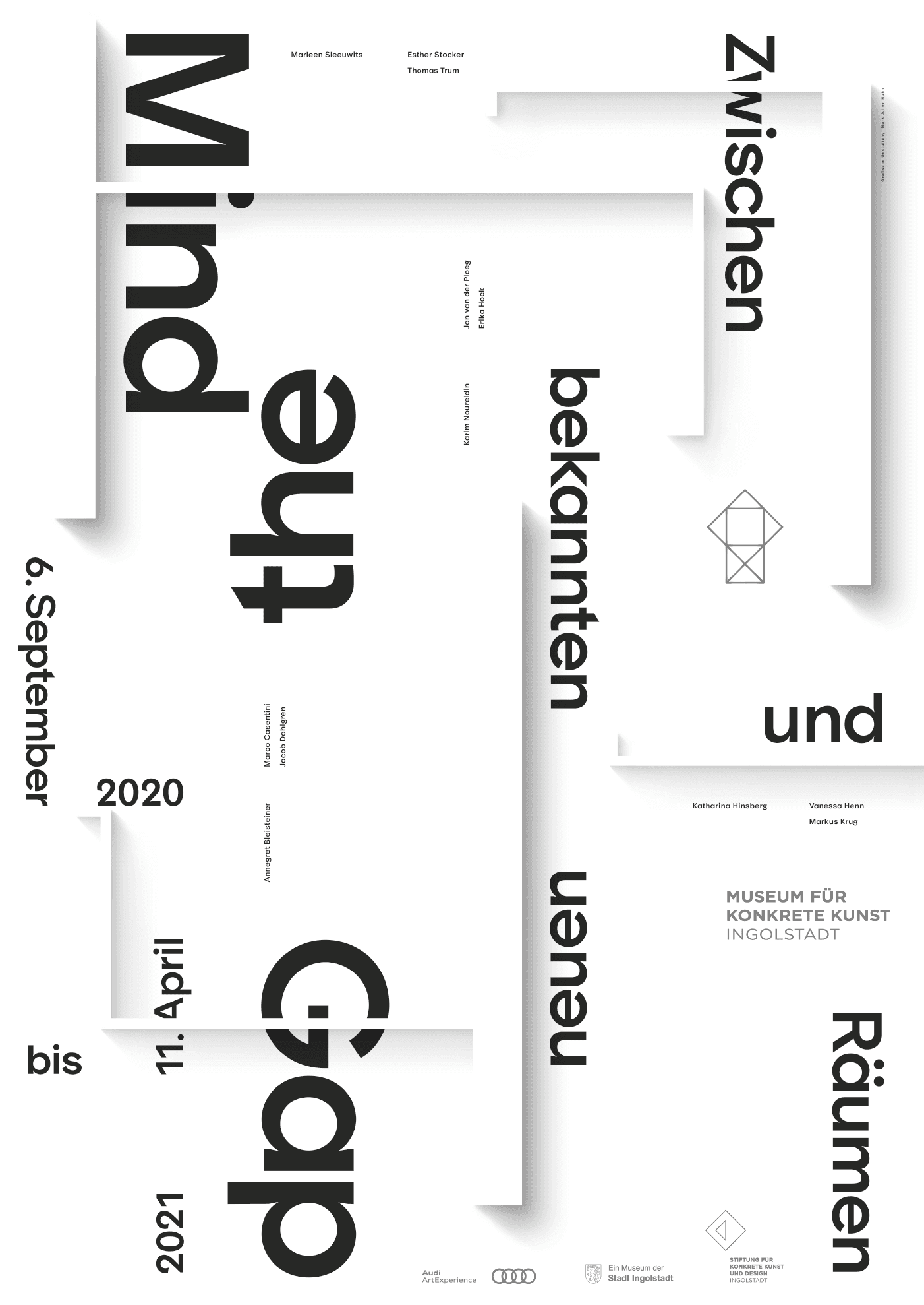 The exhibition Mind the Gap, held at the Ingolstadt Museum of Concrete Art and Design from September 2020 to June 2021, marked a pivotal moment in the institution’s history. As the final exhibition in the museum’s old building before its relocation to a newly constructed space later that year, the project explored themes of transition and transformation. The title itself, Mind the Gap, underscored the tension between the past and future, inviting reflection on the liminal space between departure and arrival. At the core of the exhibition’s identity was an exploration of space as both a physical and conceptual subject. The design subtly engaged with the architecture of absence and possibility, employing shadows and negative space to suggest forms yet to emerge. This understated approach mirrored the exhibition’s themes, highlighting the potential of emptiness and the ways in which space can frame new beginnings. Through its restrained yet evocative visual language, the identity became an integral part of the dialogue on transition, echoing the museum’s shift from its historical foundation to a fresh chapter.